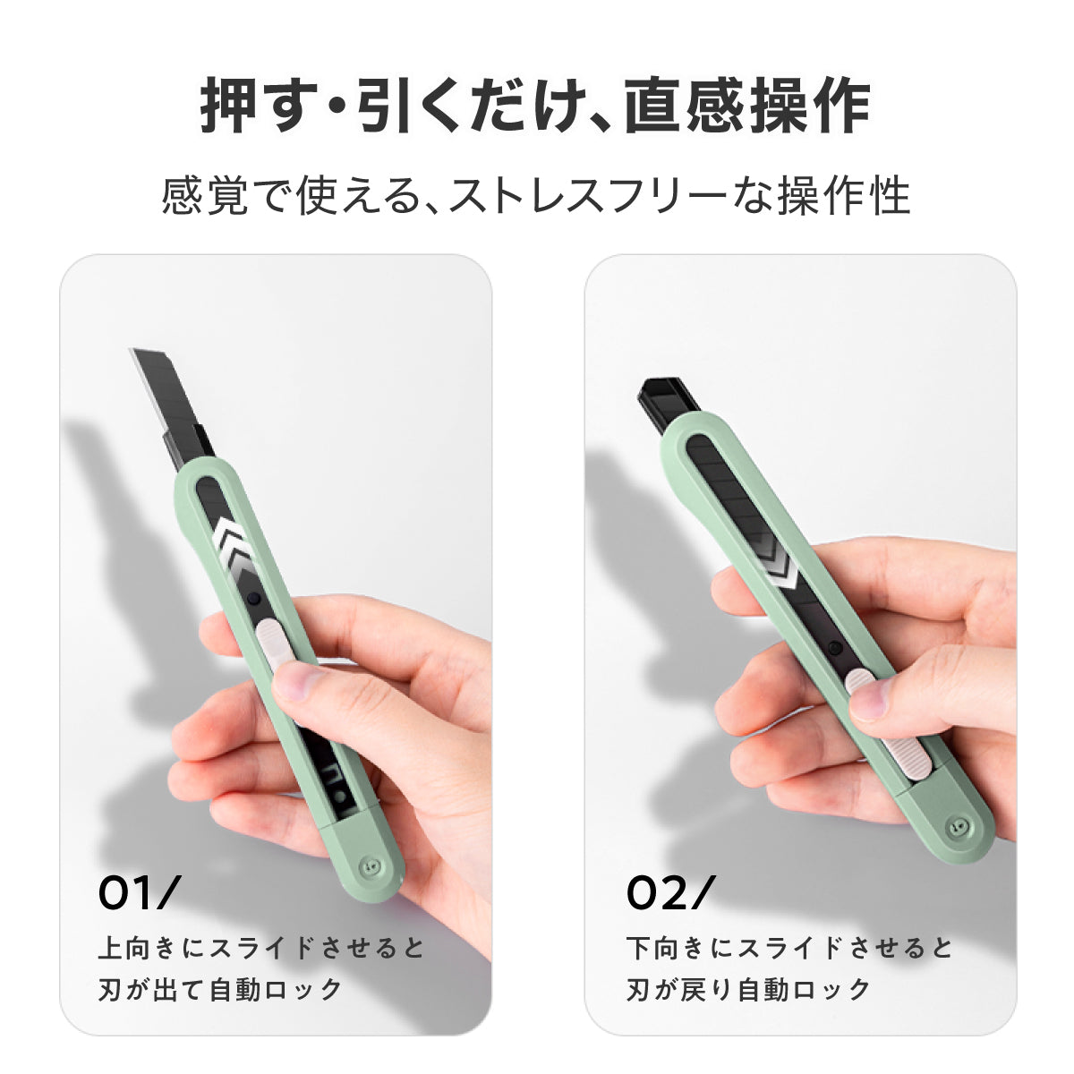離すと自動ロックされるので、刃の長さ調整も容易です。