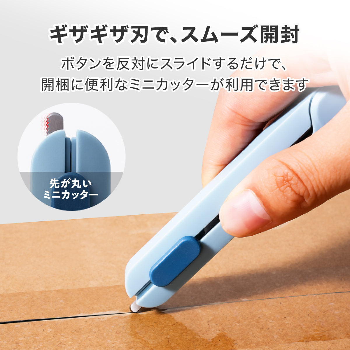 ボタンを反対にスライドするだけで、開梱に便利なミニカッターが利用できます。
