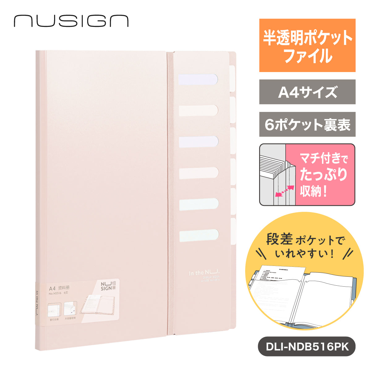 半透明ポケットファイル 6ポケット マチ付き ピンク