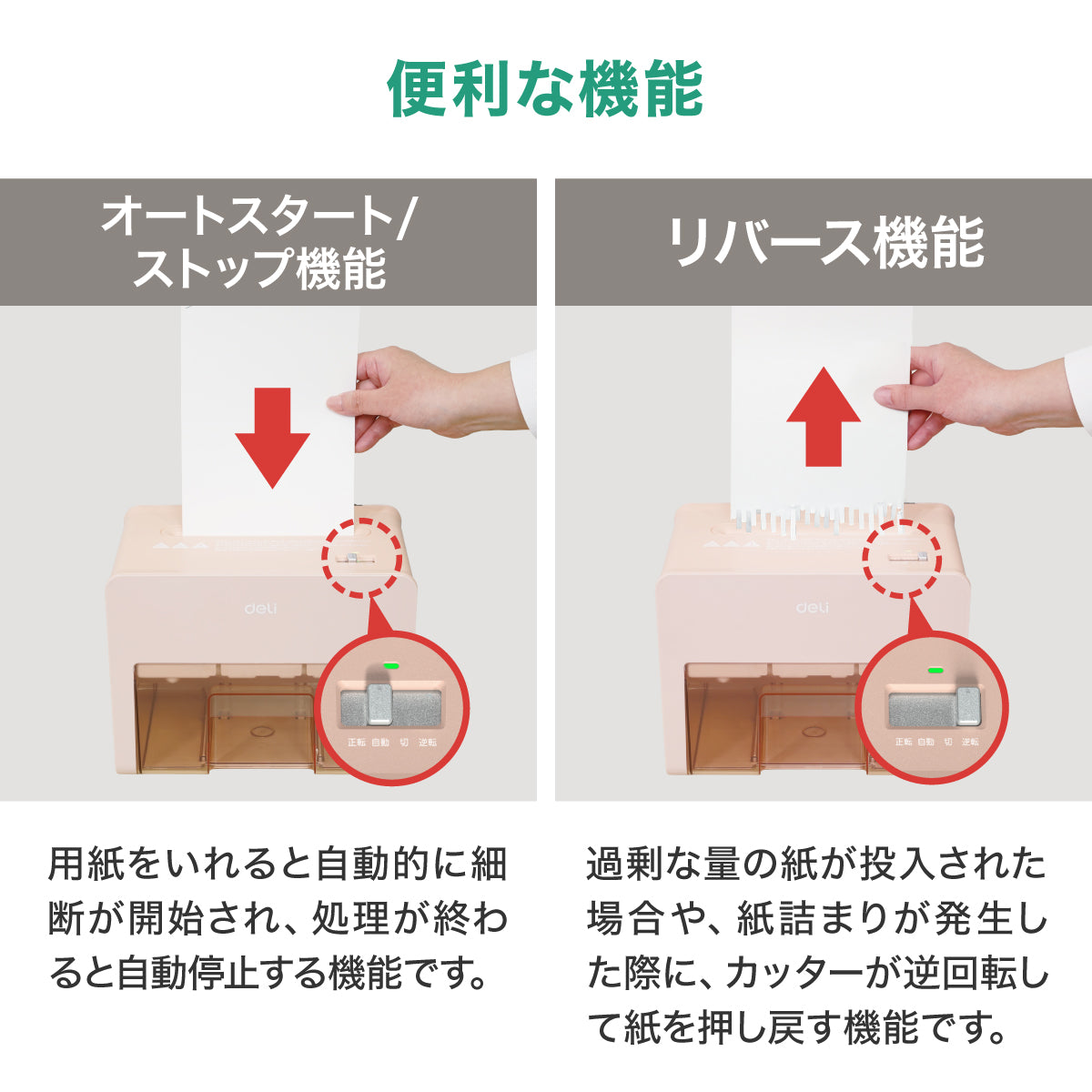 コンパクトながら、1.6m/分の細断速度で効率的に処理。連続10分間の稼働が可能で、日常的な使用に十分な性能を備えています。待機電力はわずか0.64Wと省エネ設計です。