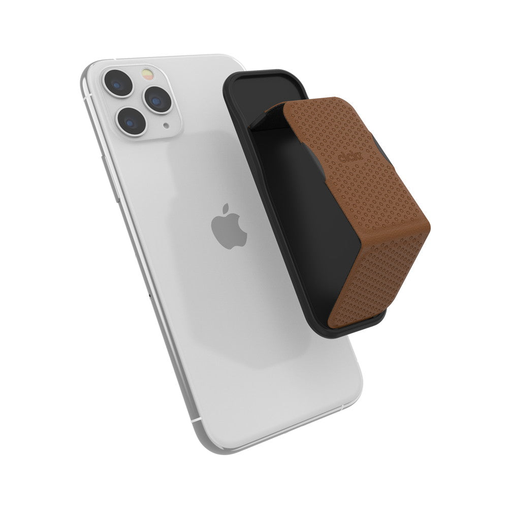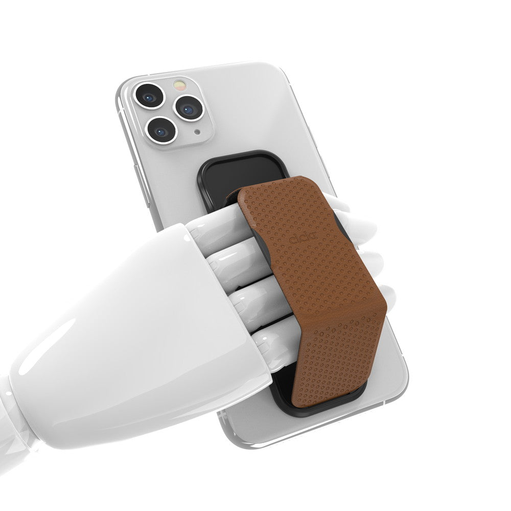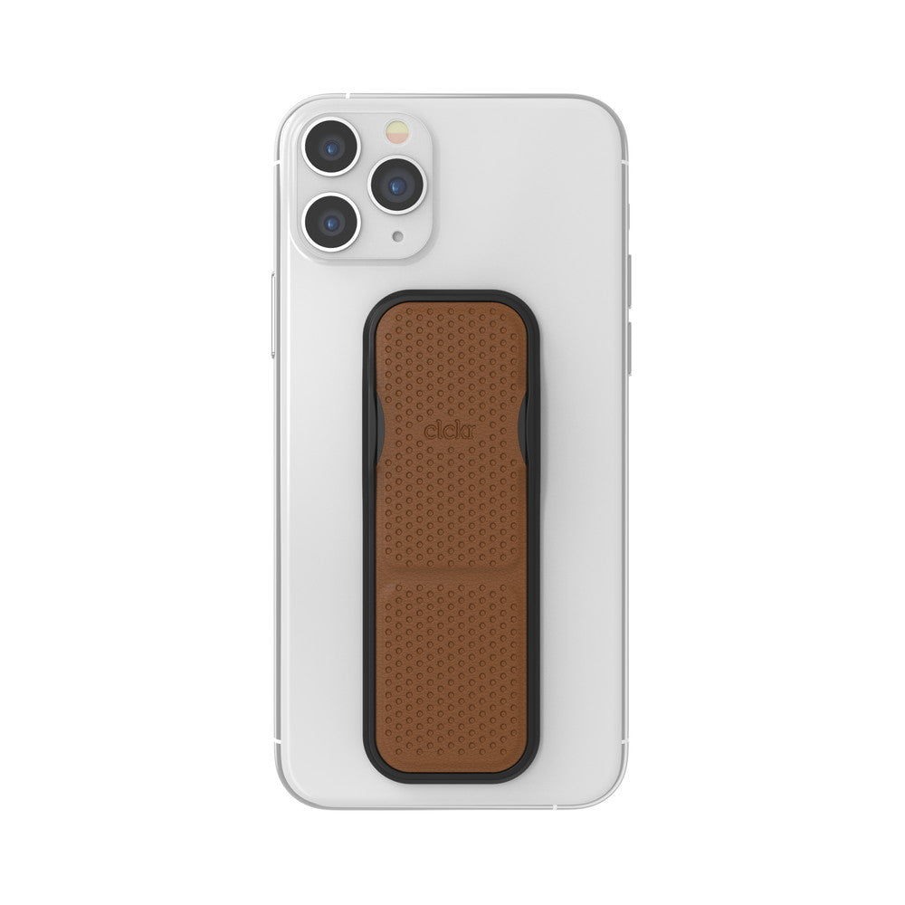 パンチホールデザインが特長的なclckrです。スマートフォンの背面に3M接着を行うことで、しっかりとした持ち心地とスタンドとしての使い方ができます。