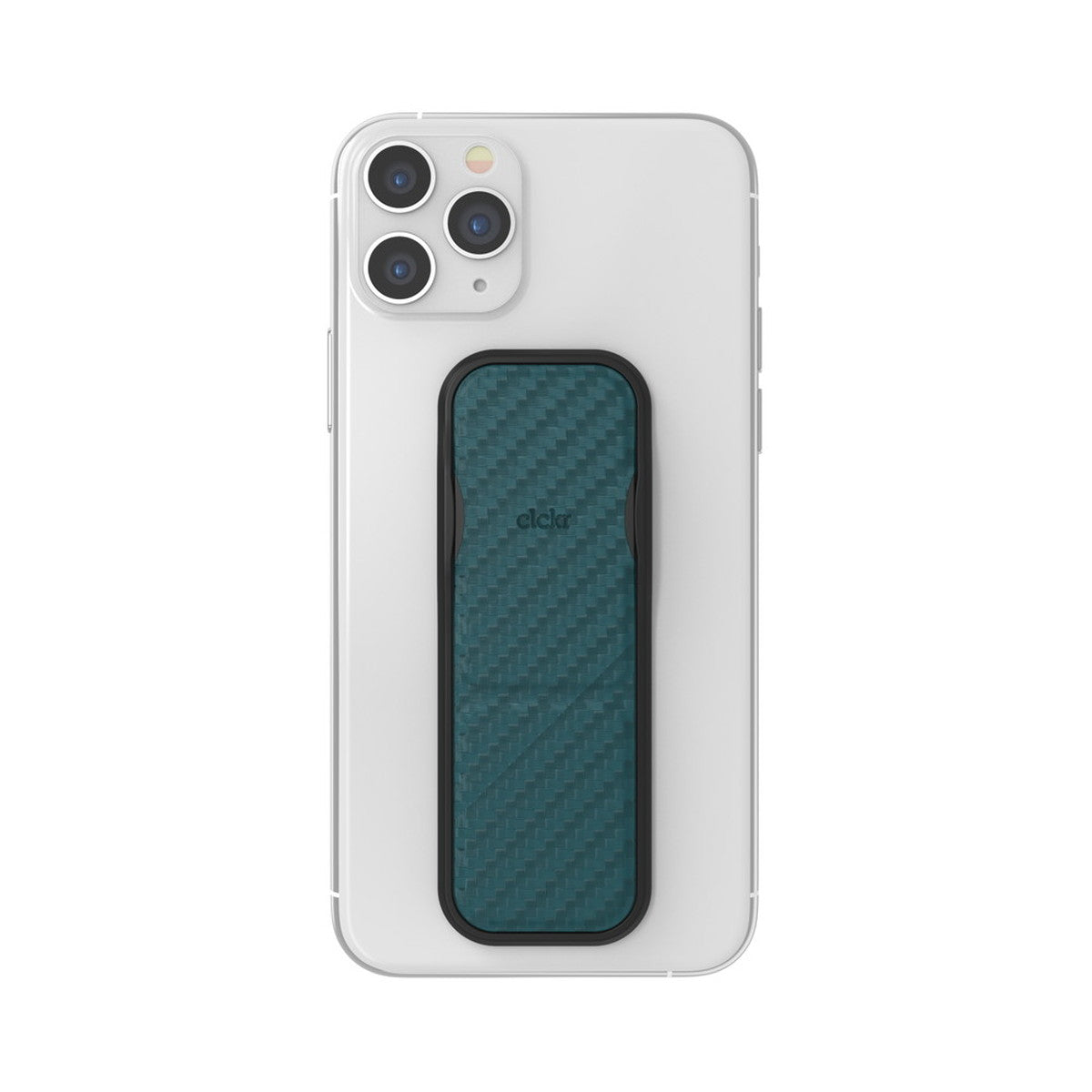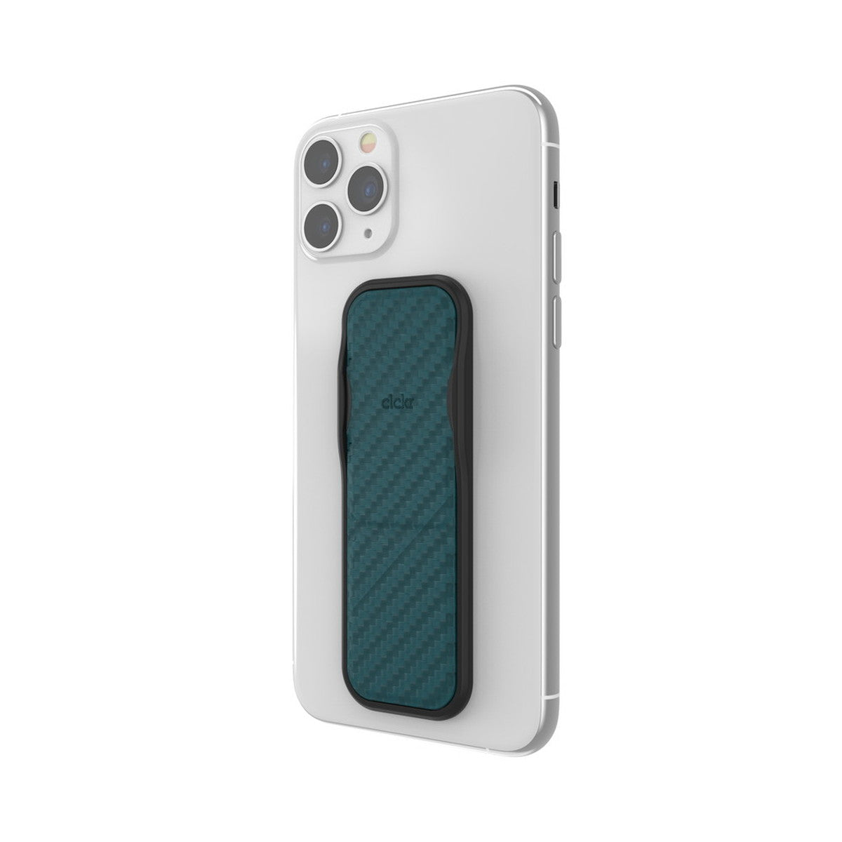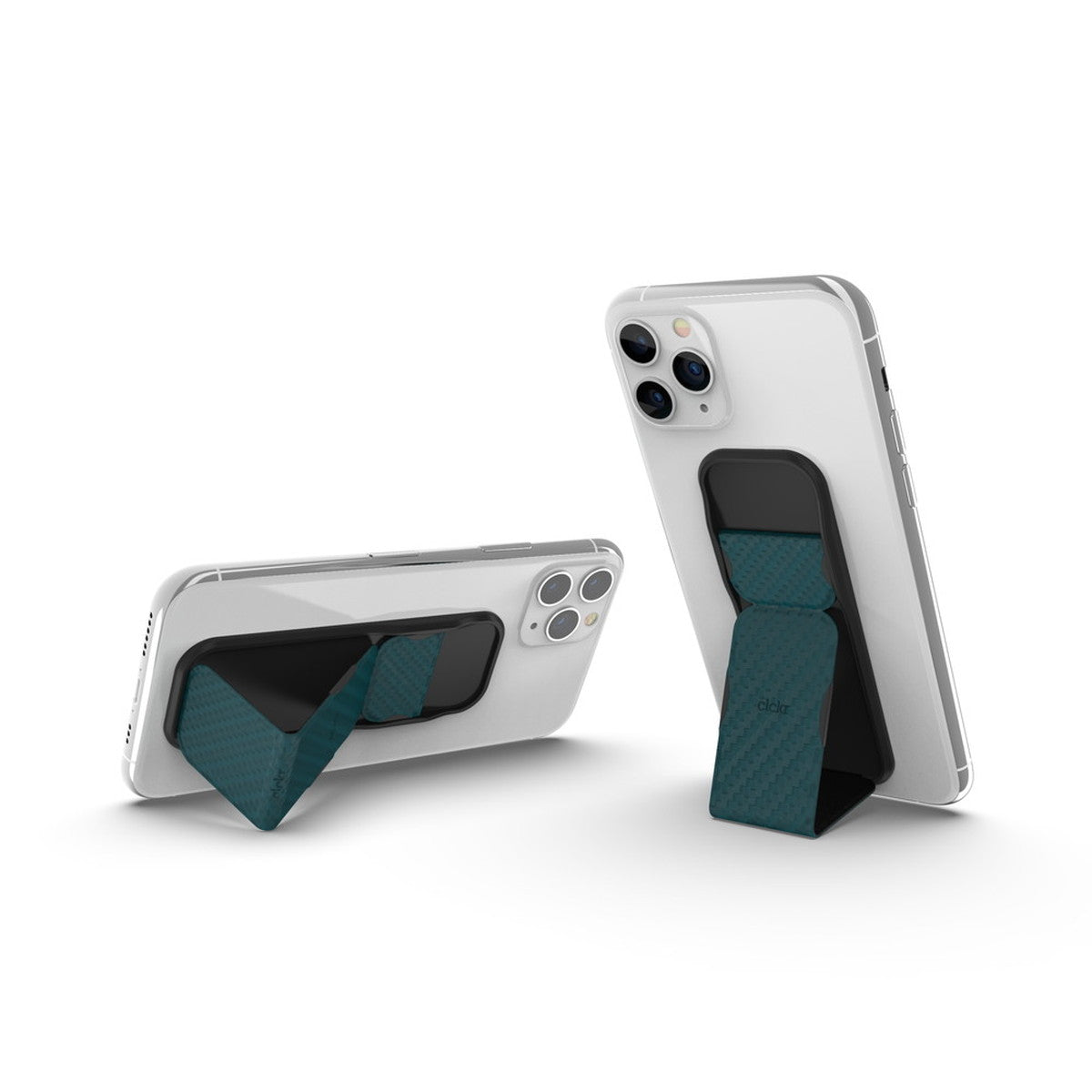 ケブラー調のデザインのclckrです。スマートフォンの背面に3M接着を行うことで、しっかりとした持ち心地とスタンドとしての使い方ができます。