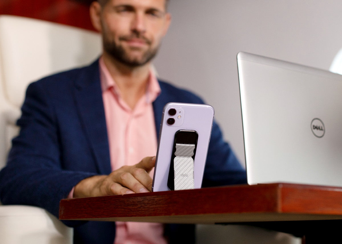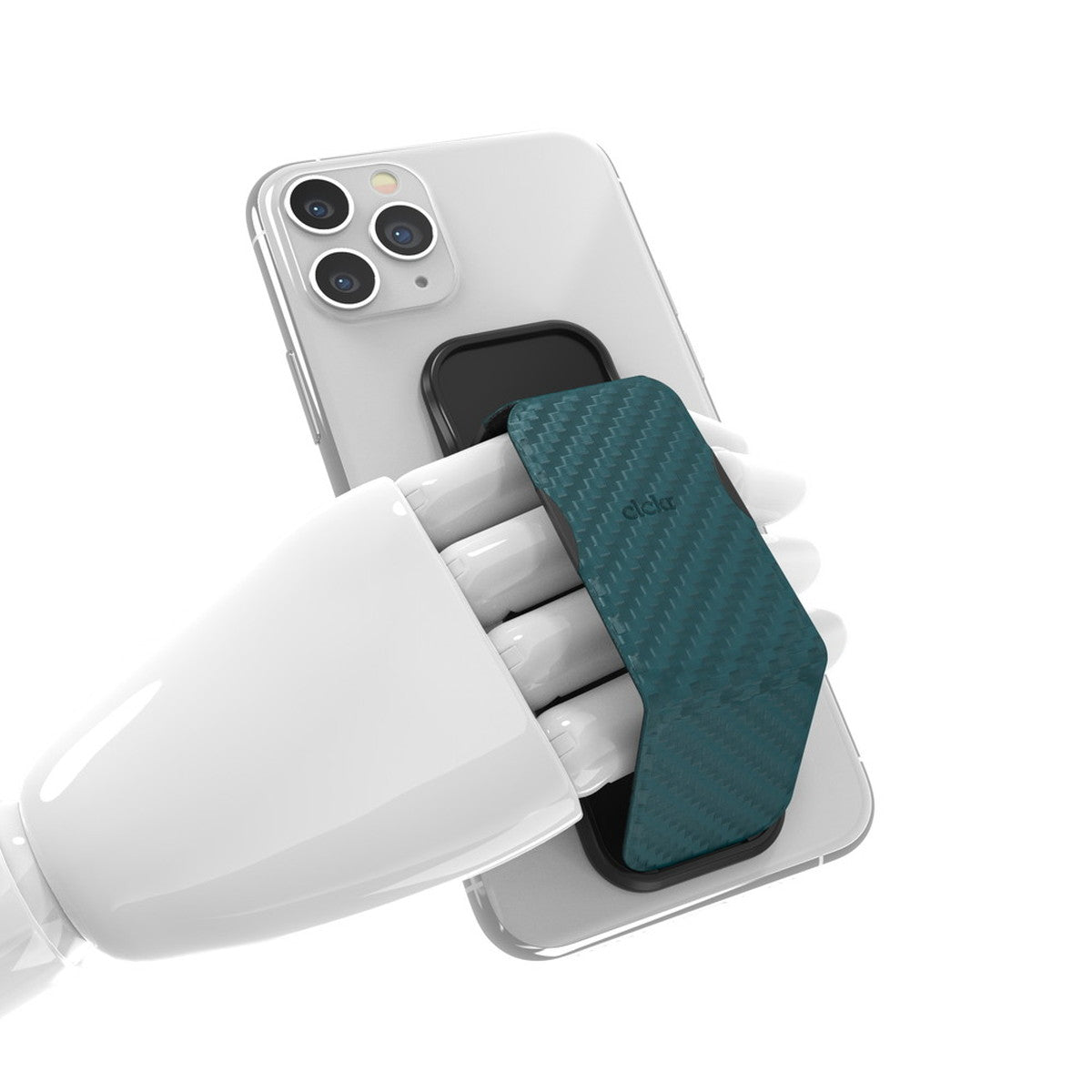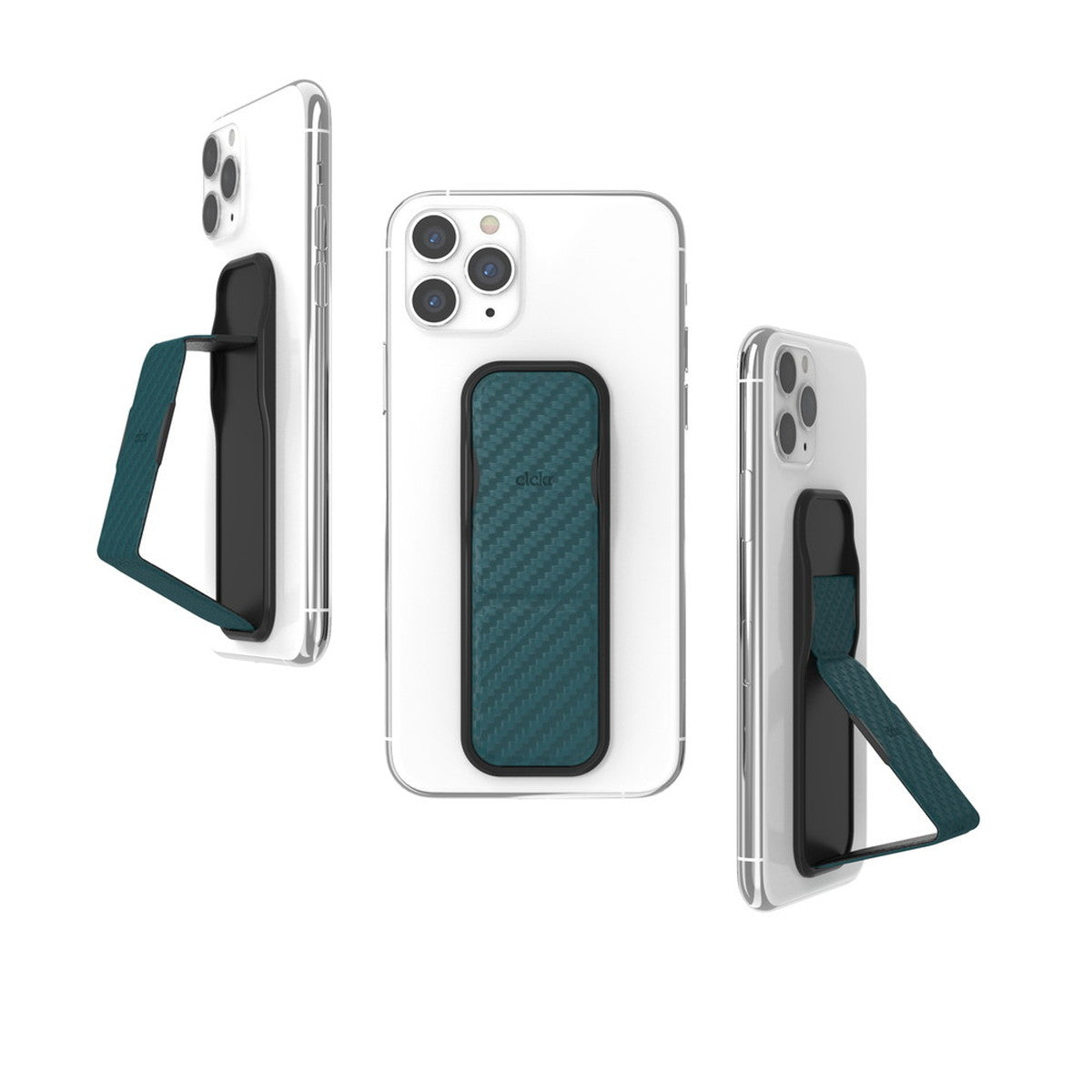 ケブラー調のデザインのclckrです。スマートフォンの背面に3M接着を行うことで、しっかりとした持ち心地とスタンドとしての使い方ができます。
