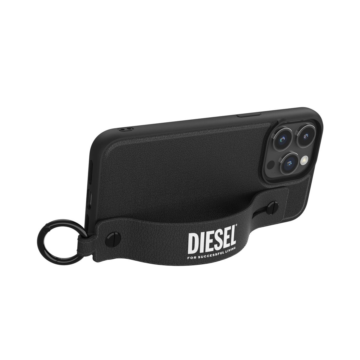 レザー調のインレイ、コントラストが効いたホワイトのロゴ入りストラップ、マットブラックの金具が特徴的なiPhoneケースです。